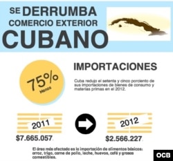 Cuba redujo en un 75 por ciento sus importaciones de bienes de consumo y materias primas el pasado año, al tiempo que sus exportaciones sólo llegaron a la mitad de las cifras alcazadas en 2011, según datos de la firma Trade que realiza análisis internacionales de comercio exterior.