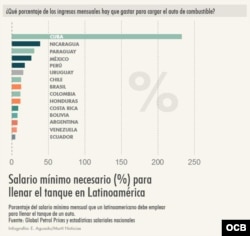 Las diferencias son mínimas, pero se acrecientan si se mide cuánto ganan los ciudadanos de cada país. Mientras uruguayos y argentinos tienen un salario mínimo de $352 y $662, respectivamente; los cubanos apenas llegan a $23 de salario medio (la Oficina Nacional de Estadísticas e Información, ONEI, no ofrece datos de salario mínimo). Es decir, en Cuba llenar el tanque de gasolina cuesta más del doble de lo que se gana en un mes (el 233%); mientras que para los otros dos países más caros de la región sólo supone, como mucho, gastar una sexta parte de los ingresos.