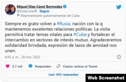 "Siempre es grato volver a Rusia, nación con la que mantenemos excelentes relaciones políticas", escribió Díaz-Canel en Twitter.